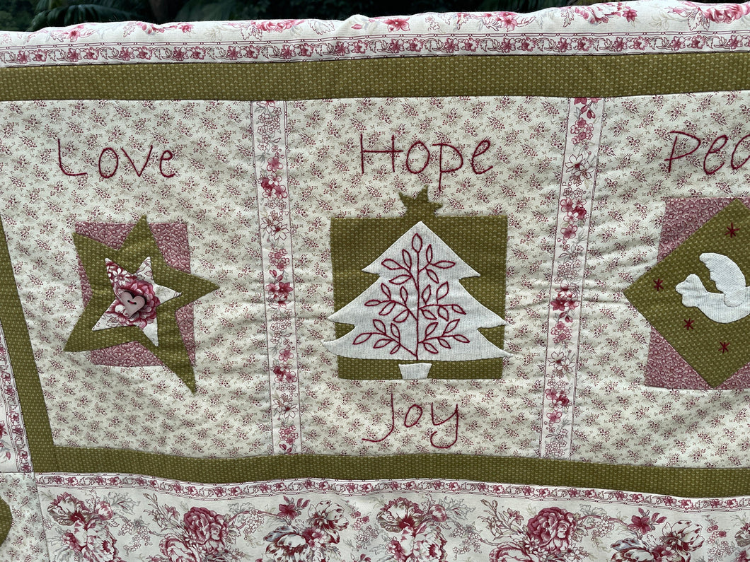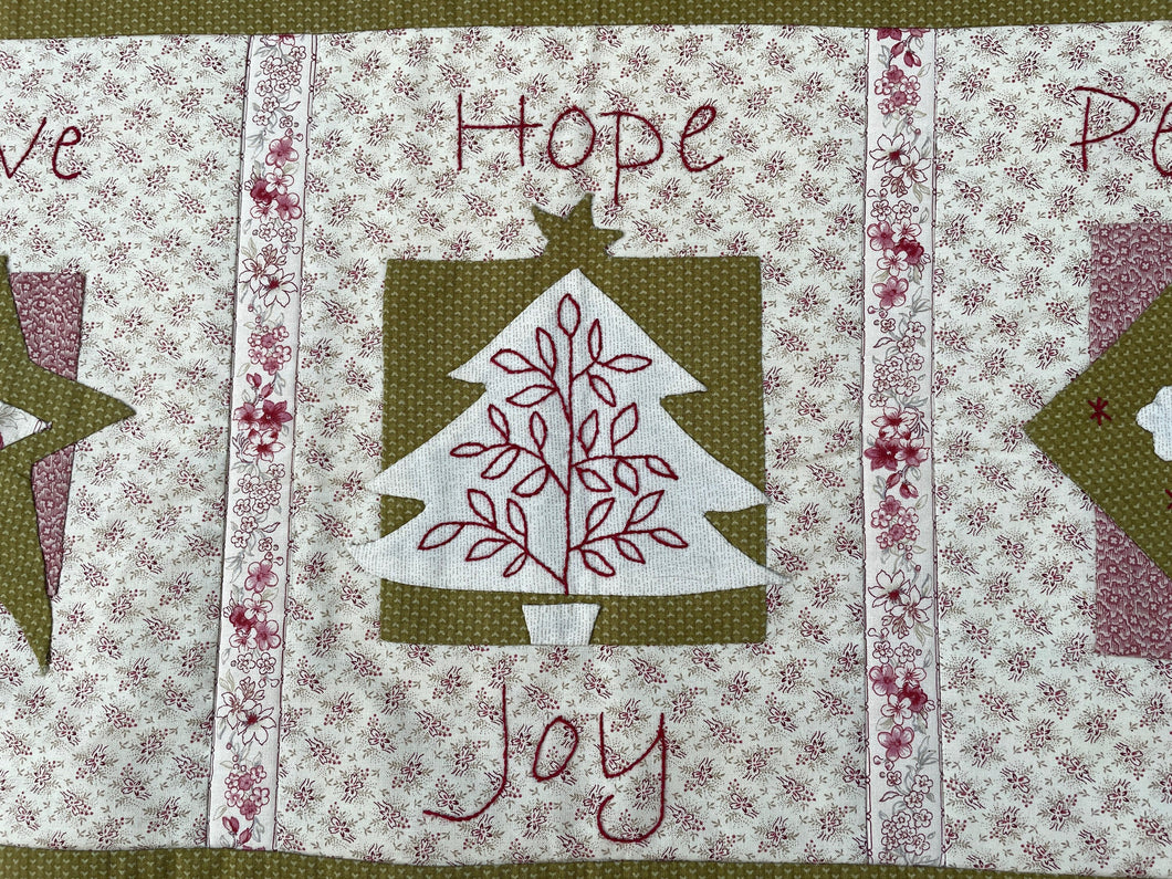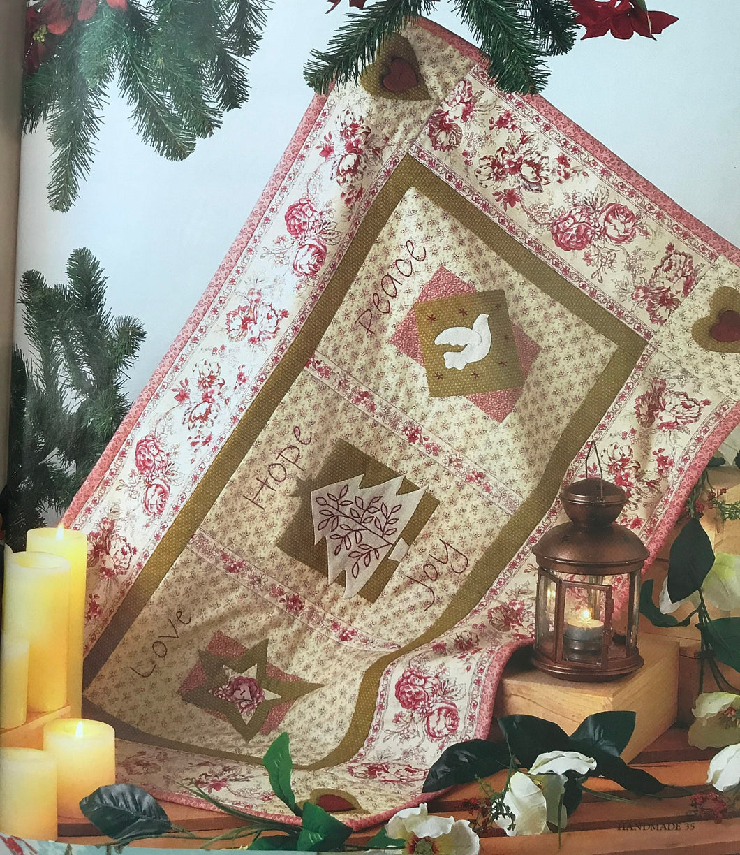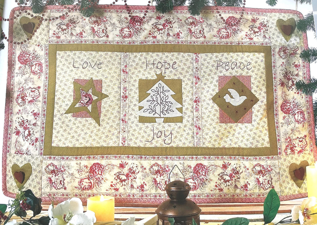 This design can be made into wall quilt or table runner. Softer colours have been used rather than the traditional Christmas red and greens. This allows you to use the project all year round if you so desire. Four Christmas placemat designs are included in pattern. The designs have been appliquéd and embroidered. Decorative wooden buttons have been added to each of the appliquéd corner hearts.